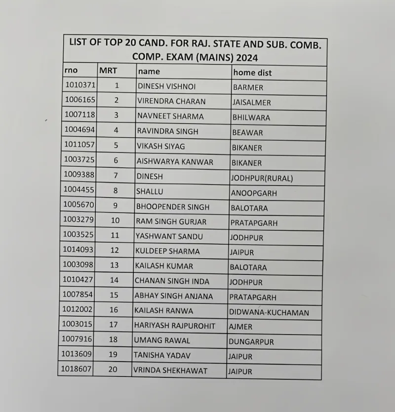 मेरिट सूची में कुल 2391 अभ्यर्थियों को शामिल किया गया है। टॉप-10 में दिनेश विश्नोई (1st), वीरेंद्र चारण (2nd), नवनीत शर्मा (3rd), रवींद्र सिंह (4th), विकास सियाग (5th), ऐश्वर्या कंवर (6th), दिनेश (7th), शालू (8th), भूपेंद्र सिंह (9th) और राम सिंह गुर्जर (10th) शामिल हैं। वहीं 20वें स्थान पर वृंदा शेखावत रहीं।