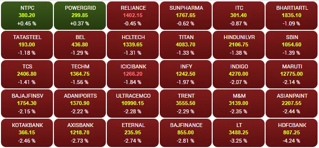 शुरुआती कारोबार में सेंसेक्स पैक के 30 में से 28 शेयरों में गिरावट देखने को मिली, जबकि केवल 2 शेयर बढ़त में रहे। सबसे ज्यादा गिरावट एचडीएफसी बैंक में करीब 4.24 फीसदी दर्ज की गई। इसके अलावा लार्सन एंड टुब्रो, बजाज फाइनेंस, एक्सिस बैंक, कोटक बैंक, एशियन पेंट्स और महिंद्रा एंड महिंद्रा के शेयरों में भी गिरावट देखने को मिली। वहीं एनटीपीसी और पावरग्रिड के शेयरों में हल्की बढ़त देखने को मिली।