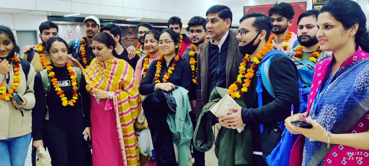 मुख्यमंत्री गहलोत के निर्देशों के अनुरूप एयरपोर्ट पर बनाए गए 24 × 7 हेल्पडेस्क पर यूक्रेन से लौटे इन बच्चों का फूल मालाओं से स्वागत राजस्थान के कैबिनेट मंत्री ममता भूपेश, टीकाराम जूली मंत्री सुभाष गर्ग, प्रमुख आवासीय आयुक्त शुभ्रा सिंह राजस्थान फाउंडेशन के आयुक्त धीरज श्रीवास्तव ने किया।