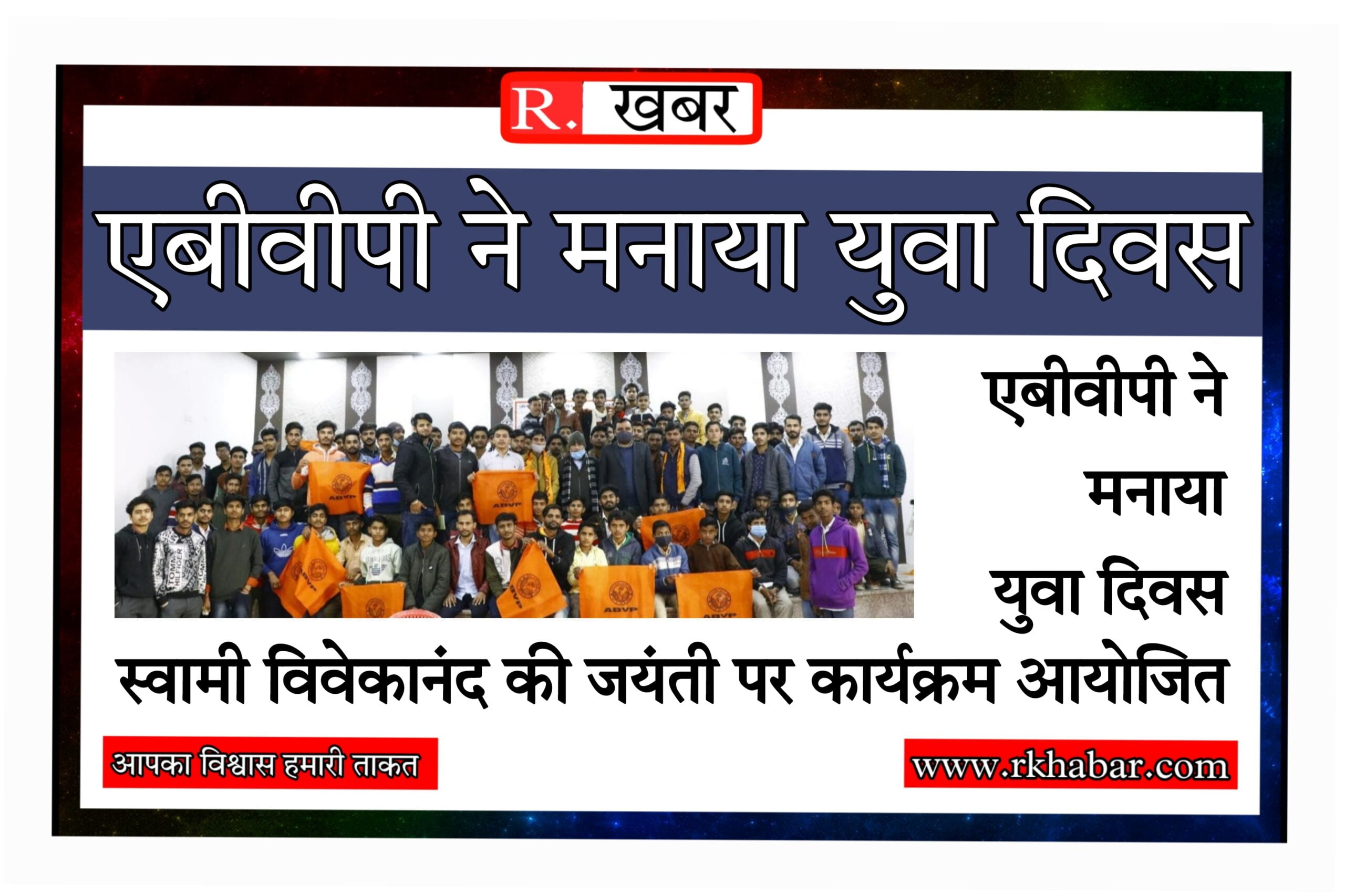 नगर सह मंत्री यश सारस्वत ने बताया कि एबीवीपी द्वारा बुधवार को जाट धर्मशाला में स्वामी विवेकानन्द जयन्ती युवा दिवस के रूप में मनाई। यहां वक्ताओं ने स्वामी विवेकानंद की जीवनी पर प्रकाश डाला। इस मौके पर विद्यालयों की कार्यकारिणी का गठन हुआ। कार्यक्रम में प्रदीप भाम्भू ने कहा कि हमारे देश में आज के दिन युवा दिवस मनाया जाता है। स्वामी विवेकानन्द ने कम उम्र में ही भारत को विश्व में पहचान दिलवाई थी। कार्यक्रम के बाद सभी कार्यकर्ताओं व पदाधिकारियों ने उपखण्ड अधिकारी को गोचर भूमि के पट्टे कानून के विरोध में ज्ञापन दिया गया। इस मौके पर किसानों के आन्दोलन को समर्थन दिया गया।