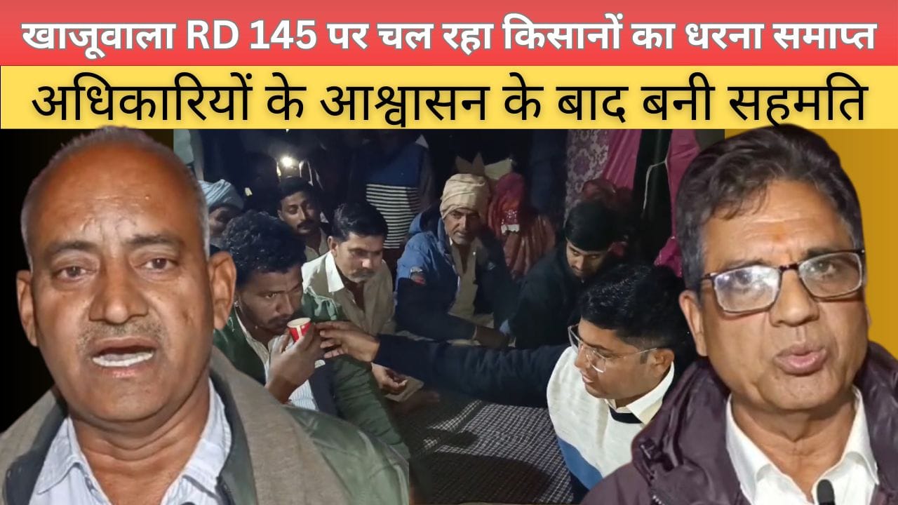 किसान रामकुमार गोदारा व शिवदत्त सिग्गड़ ने बताया कि खाजूवाला के केवाईडी नहर की आरडी 145 पर किसानों धरना 11 वें दिन देर रात्रि को प्रशासन व सिंचाई विभाग के अधिकारियों के साथ किसानों की वार्ता हुई। जिसमें सभी मांगो पर सहमति बनने के बाद भूख हड़ताल पर बैठे 5 किसानों को दुग्ध पिलाकर भूख हड़ताल समाप्त की। वही साथ ही धरना समाप्ति की घोषणा की। किसानों ने बताया कि अधिकारियों ने आश्वासन दिया है कि मोघो व माइनरों की जांच पी-फार्म से करके 15 दिनों में सही कर दिया जाएगा। अन्यथा 16 फरवरी से धरना फिर से शुरू कर दिया जाएगा।