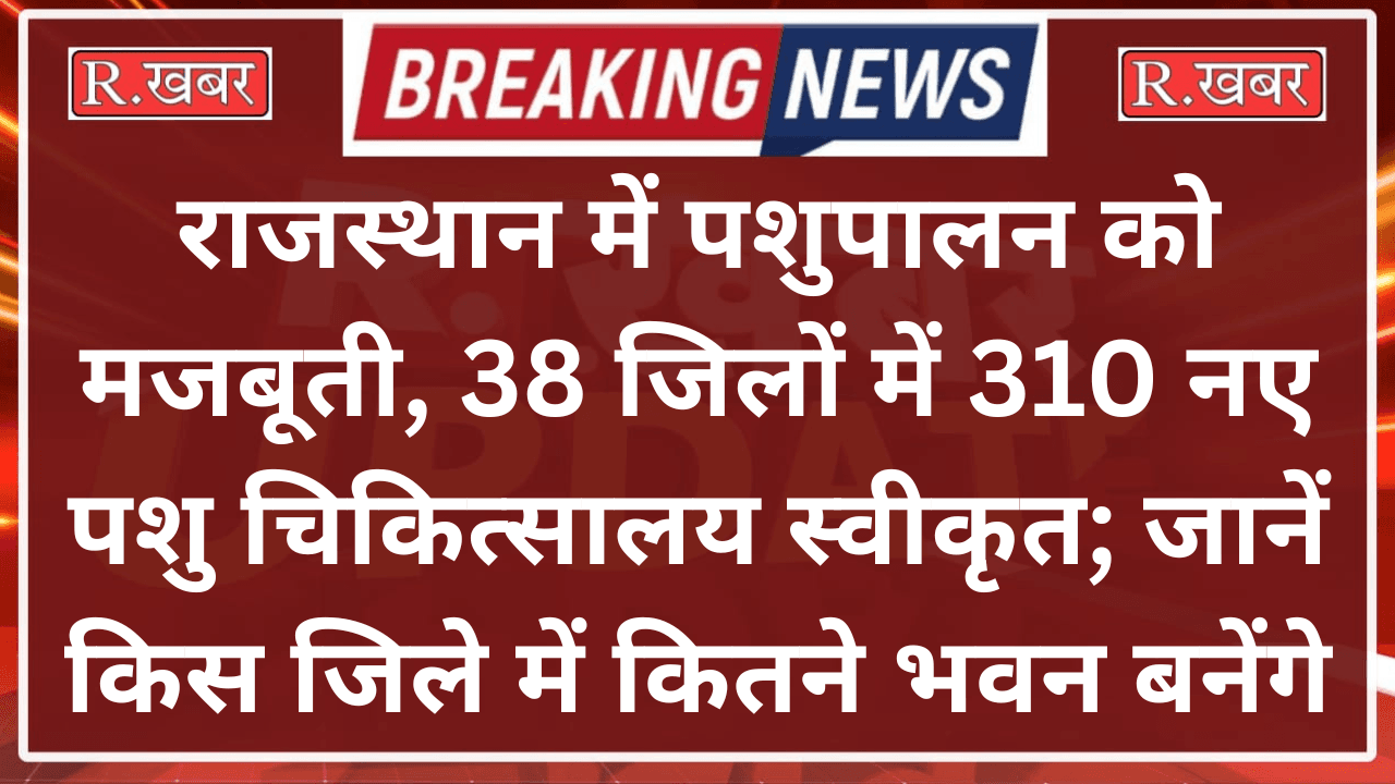 R.खबर ब्यूरो। जयपुर, राज्य सरकार ने पशु चिकित्सा ढांचे को सुदृढ़ बनाने की दिशा में बड़ा कदम उठाते हुए प्रदेश के 38 जिलों में 310 नए पशु चिकित्सालय भवनों के निर्माण को मंजूरी दे दी है। इसके लिए कुल 144 करोड़ 15 लाख रुपए की स्वीकृति जारी की गई है। प्रत्येक नए भवन के लिए 46.50 लाख रुपए का बजट निर्धारित किया गया है।