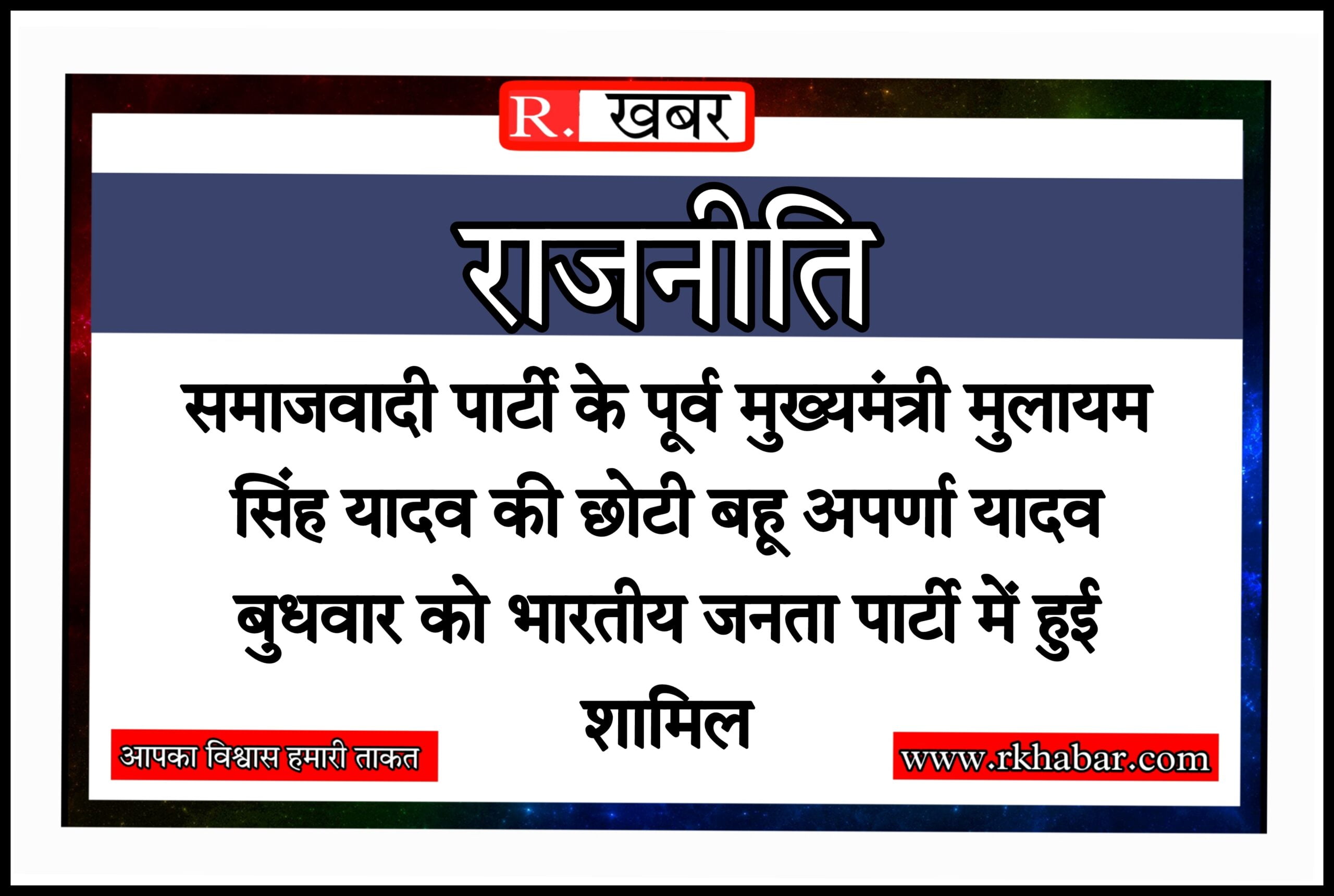 R.खबर, समाजवादी पार्टी के संरक्षक और पूर्व मुख्यमंत्री मुलायम सिंह यादव की छोटी बहू अपर्णा यादव बुधवार को भारतीय जनता पार्टी में शामिल हो गईं। अपर्णा के भाजपा में शामिल होने को जहां भाजपा अखिलेश यादव की बड़ी नाकामी बताते हुए परिवार तक न संभाल पाने का तंज कस रही है। वहीं इस मौके पर अपर्णा यादव ने यह कहकर सबको चौंका दिया कि वे मुलायम सिंह यादव का आशीर्वाद लेकर आई हैं। अपर्णा ने कहा सभी लोग जानते हैं कि मैं प्रधानमंत्री नरेन्द्र मोदी से प्रभावित रही हूं। मेरे चिंतन में राष्ट्र सबसे पहले है। राष्ट्र का धर्म मेरे लिए सबसे ज्यादा जरूरी है। मैं राष्ट्र की अराधना करने निकली हूं। इसमें मुझे सबका सहयोग चाहिए।’ अपर्णा ने प्रधानमंत्री नरेन्द्र मोदी द्वारा शुरू की गई योजनाओं खासकर स्वच्छ भारत अभियान और महिलाओं तथा बेरोजगारों के लिए शुरू की गई योजनाओं की तारीफ की।