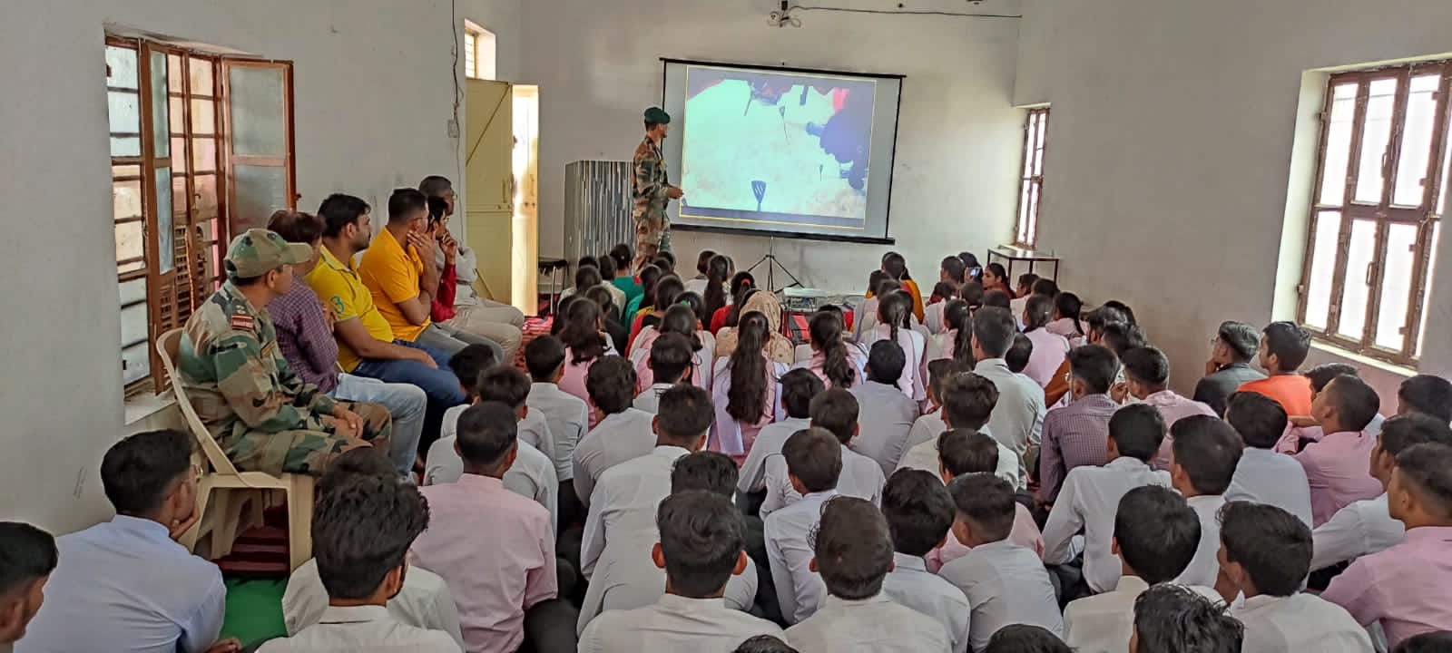 सेना की 10 वी बटालियन महार रेजीमेंट द्वारा गुरुवार को सीमा क्षेत्र के युवा बच्चों के साथ एक कार्यक्रम का आयोजन किया गया। जो उनको सेना में भर्ती होने के लिए प्रोत्साहन दे रहा है। सीमावर्ती क्षेत्र में स्कूलों में पढ़ने वाले बच्चों को भारतीय सेना के द्वारा स्कूल आउटरीच प्रोग्राम के तहत सेना में भर्ती करने के लिए प्रेरित करने के उद्देश्य से खाजूवाला क्षेत्र के निजी व सरकारी विद्यालयों में इंडियन आर्मी के अधिकारियों के द्वारा पहुंचकर मोटिवेशन किया जा रहा है। ताकि स्कूलों में पढ़ने वाले बच्चे भी आगे जाकर देश सेवा में अपनी भागीदारी निभा सके। इसके लिए खाजूवाला के निजी विद्यालय में इंडियन आर्मी के अधिकारियों के द्वारा मोटिवेशन क्लास आयोजित की गई। जिसमें 10 महार रेजीमेंट के मेजर नरेंद्र सिंह, सुबदार नरसी राम लटियाल के द्वारा बच्चों को भारतीय सेना अन्य देश की सीमाओं पर रक्षा करने वाली सर्विस के लिए मोटिवेशन किया।
