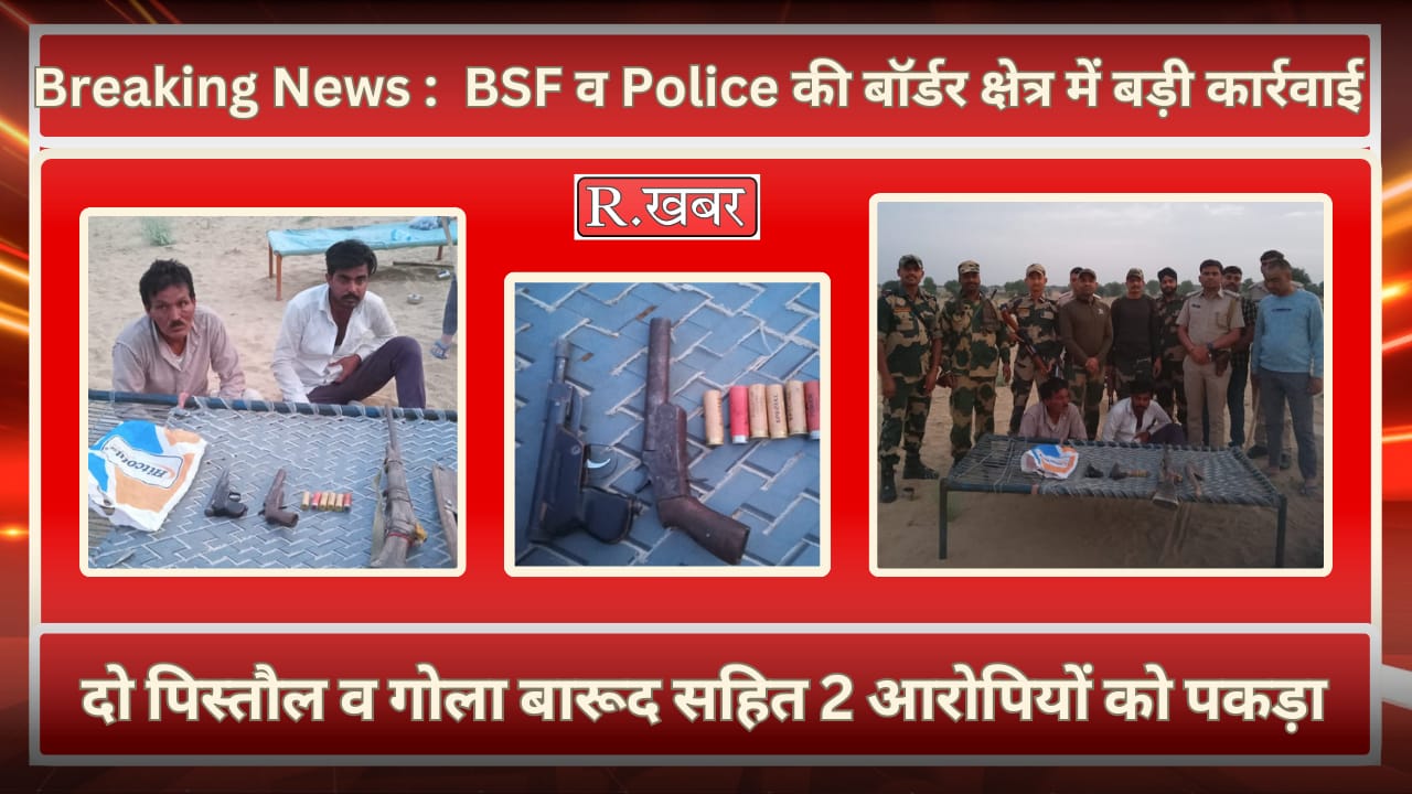 पुलिस में बीएसएफ से मिली जानकारी के अनुसार सीमावर्ती क्षेत्र में संयुक्त रूप से गस्त करते हुए टीम ने संयुक्त तलाशी अभियान चलाया। जिसमें दंतोर थानाधिकारी जेठाराम सहित पुलिस कांस्टेबल व बीएसएफ पार्टी के एसएम नरेंद्र सिंह सहित बीएसएफ के जवान मौजूद रहे। इन्होंने चक 13 डीडब्ल्यूडी में ओमप्रकाश गोदारा के खेत में कार्रवाई करते हुए दो देशी पिस्तौल, एक देशी भरमार राइफल, गोला बारूद 6 राउंड 12 बोर पड़ी है। वहीं संयुक्त टीम ने ओमप्रकाश गोदारा पुत्र तेजाराम गोदारा निवासी 13 डीडब्ल्यूडी तथा अरविंद पुत्र सतपाल सिंह निवासी 79 फाल को गिरफ्तार किया है। पुलिस पार्टी द्वारा आरोपियों को गिरफ्तार कर दंतोर थाने ले गए है। वहीं जांच की जा रही है।