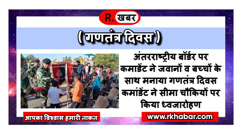 अंतरराष्ट्रीय बॉर्डर पर 114 वीं वाहिनी के कमांडेड हेमंत कुमार यादव ने सीमा चौकियों पर पहुंच कर ध्वजारोहण किया। अंतरराष्ट्रीय बॉडर पर स्थित सभी सीमा चौकियों पर ध्वजारोहण किया गया। भारत-पाक अंतरराष्ट्रीय सीमा स्थित सीमा चौकी पर आसपास के गांव के बच्चों को भी सीमा दर्शन के लिए बुलाया गया। इस मौके पर बच्चों को मिठाइयां दी गई। वही ग्राम वासियों को संबोधित करते हुए कमांडेंट हेमंत यादव ने कहा कि भारत की प्रथम सुरक्षा पंक्ति में बीएसएफ अलर्ट मोड पर है। वही सीमा पर बसे लोग भी द्वितीय पंक्ति के प्रहरी हैं। सीमा पर बसे गांव में अगर किसी भी प्रकार की अवांछनीय गतिविधि लोगों को दिखाई देती है तो उन्हें तुरंत सीमा चौकी पर सूचना देनी चाहिए तथा बीएसएफ के जवान हर समय भारत की सीमाओं की सुरक्षा के लिए कटिबद्ध है।