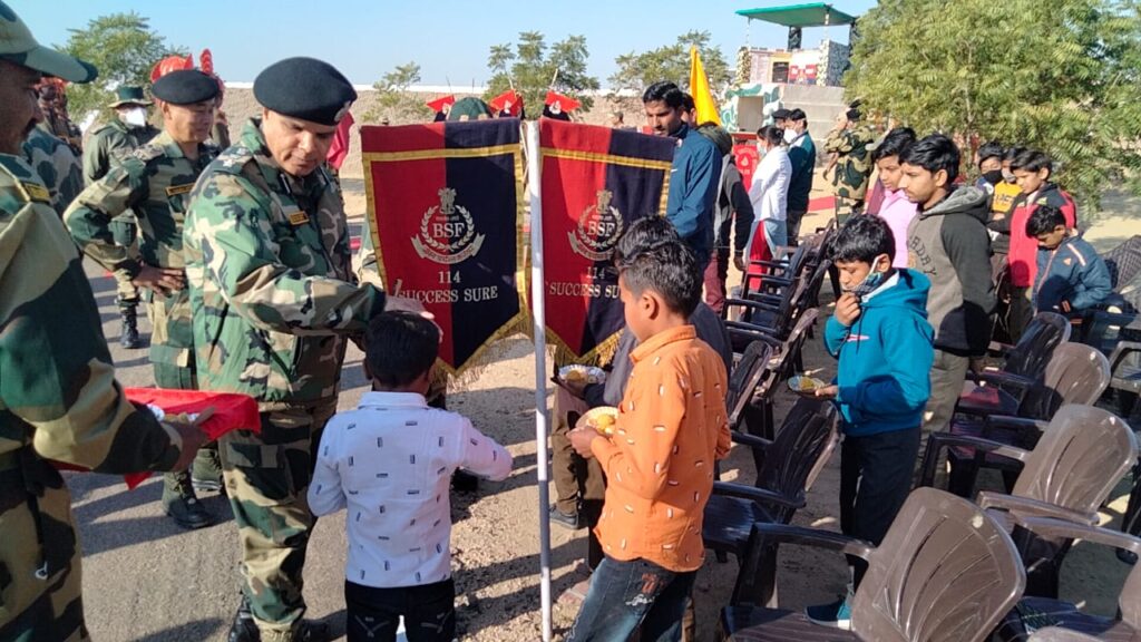 खाजूवाला, 73 वें गणतंत्र दिवस के मौके पर पड़ोसी मुल्क पाकिस्तान को बीएसएफ के अधिकारियों के द्वारा मिठाई दी गई। ऐसे में भारत-पाक अंतरराष्ट्रीय सीमा पर 73 वें गणतंत्र दिवस के मौके पर बीएसएफ 114 वी वाहिनी के कमांडेंट हेमंत यादव ने जवानों के साथ गणतंत्र दिवस मनाया। इस मौके पर आस-पास के गांव के बच्चों को भी सीमा दर्शन के लिए बुलाया गया।
