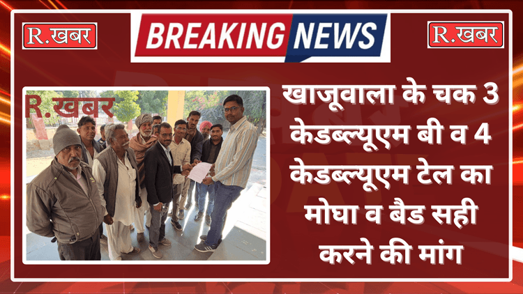 R.खबर ब्यूरो। खाजूवाला, जल उपयोक्ता संगम प्रबन्धन समिति खोयेवाली वितरीका के किसानों ने उपखण्ड अधिकारी खाजूवाला को ज्ञापन देकर चक 3 केडब्ल्यूएम बी टेल का मोघा व बैड़ सही करने की मांग रखी। किसानों ने उपखण्ड अधिकारी के नाम का अधिकारी के प्रतिनिधि को दिया।