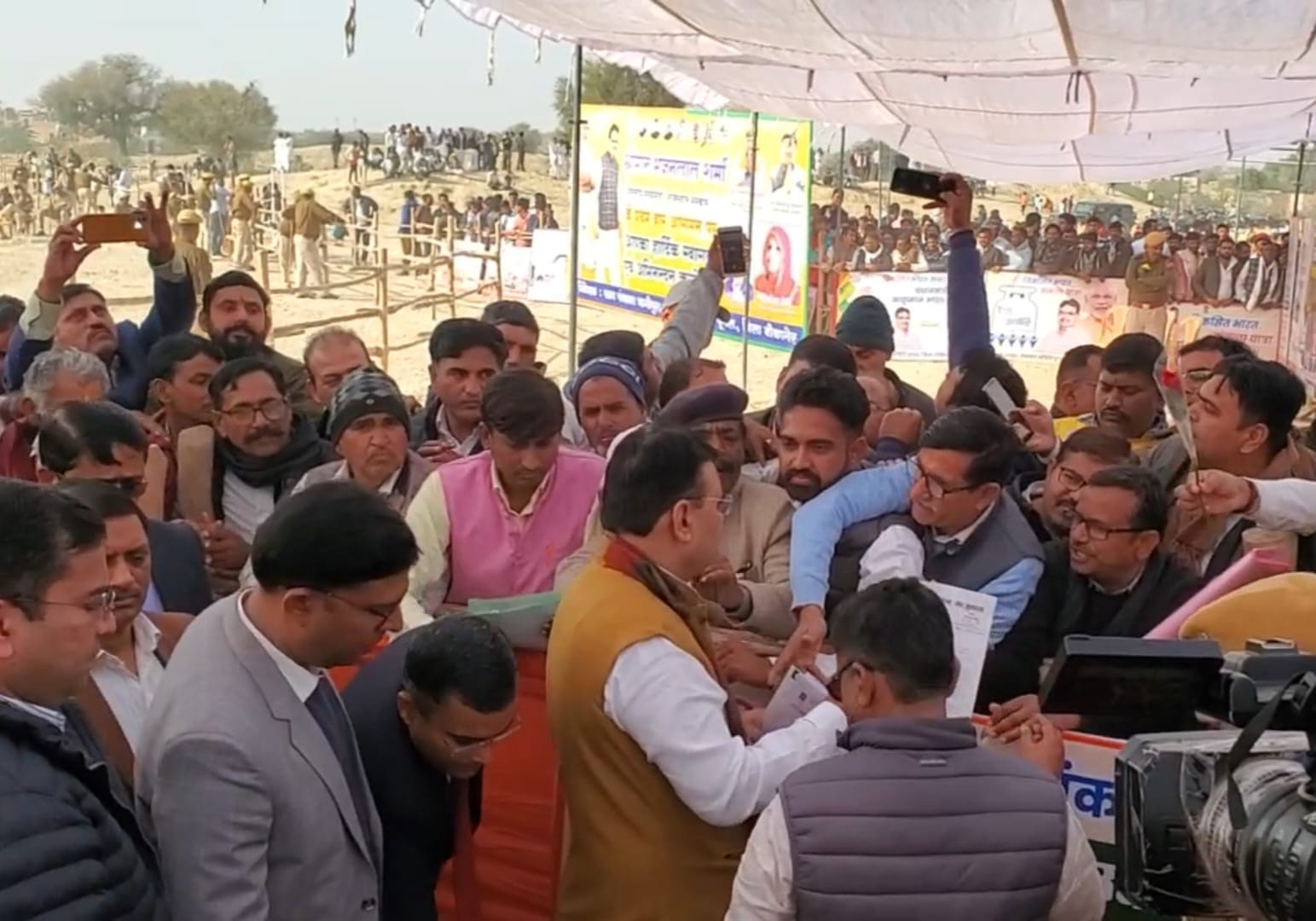 खाजूवाला, बीकानेर जिले की खाजूवाला विधानसभा के पूगल तहसील के भानीपुरा ग्राम पंचायत में विकसित भारत संकल्प यात्रा कार्यक्रम में पहुंचकर विभिन्न संगठनों ने क्षेत्र की ज्वलंत समस्याओं के बारे में अवगत करवाया गया। मुख्यमंत्री से मिलकर समस्याओं के समाधान की मांग की। खाजूवाला विधायक विश्वनाथ मेघवाल ने क्षेत्र की समस्याओं के बारे में अवगत करवाया तो मुख्यमंत्री भजनलाल शर्मा ने कहा कि आप एक काम मांगोगे मैं आपको पांच काम दूंगा। आप अपने क्षेत्र के आमजन से जुड़े जनहित के कार्य बताए सभी कार्यो को प्राथमिकता से करवाया जाएंगे। विकास में किसी भी प्रकार से कोई कमी नहीं छोड़ी जाएगी। विभिन्न संगठनों द्वारा मूलभूत सुविधाओं व क्षेत्र की समस्याओं के बारे में अवगत करवाया गया।