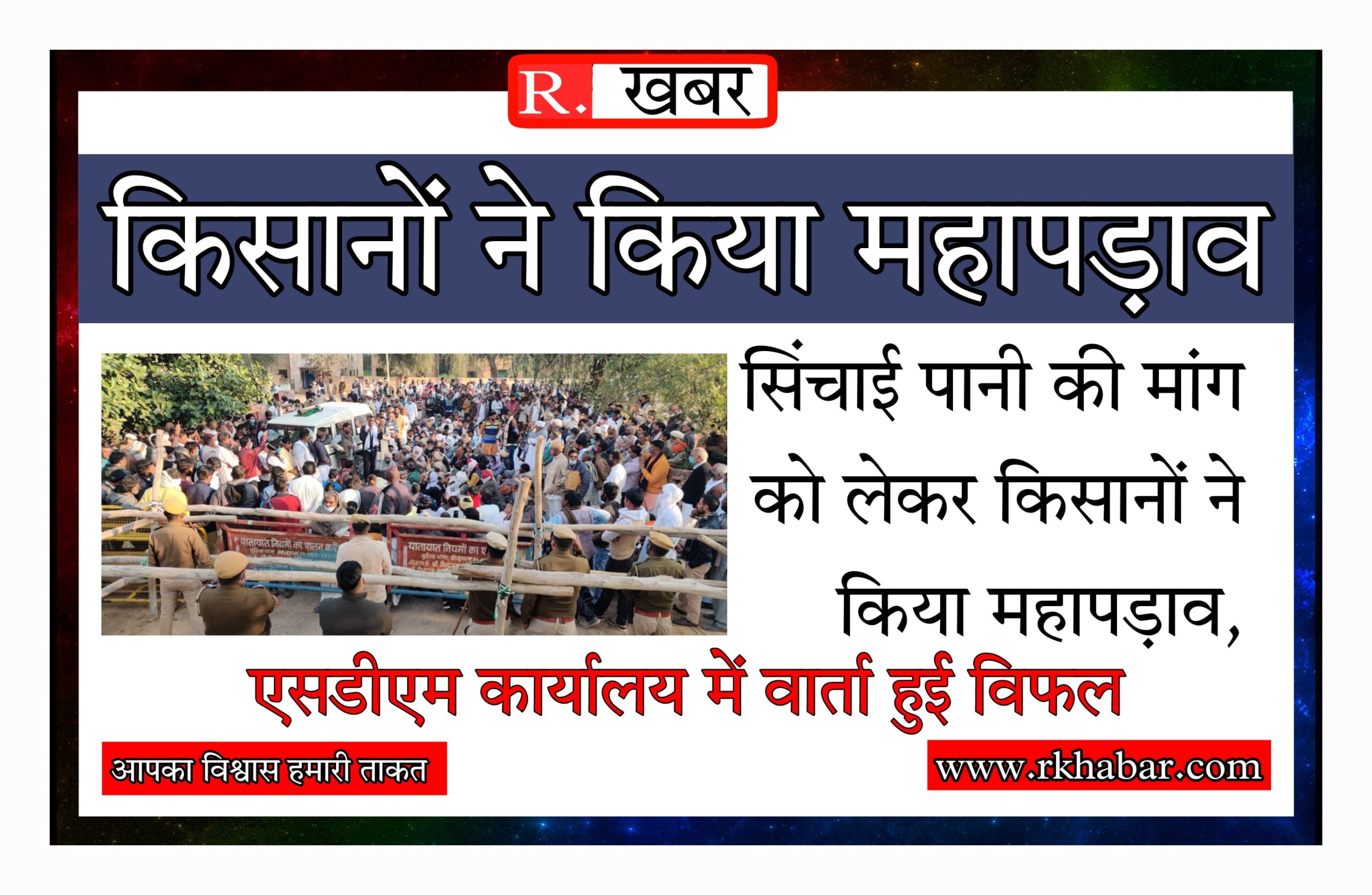 उपखण्ड अधिकारी कार्यालय में सिंचाई विभाग के अधिकारियों व किसानों के बीच वार्ता हुई। जिसमें किसानों ने 3 अतिरिक्त बारियां पानी देने तथा मार्च तक पानी तय करने की मांग की। जिसपर सिंचाई विभाग के अधिकारियों ने असमर्थता दिखाई। जिसपर किसानों व अधिकारियों की वार्ता विफल हो गई। जिसके बाद किसान आक्रोषित हुए।