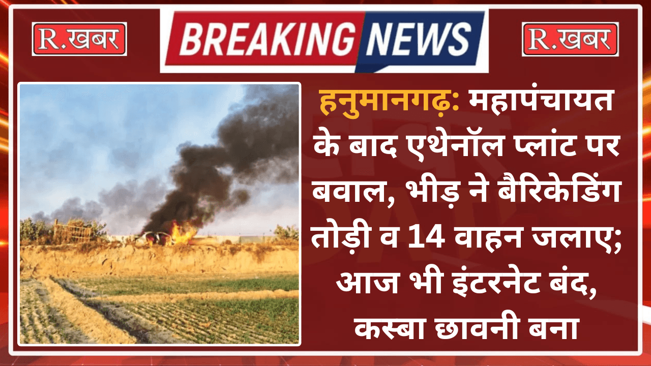 हनुमानगढ़: महापंचायत के बाद एथेनॉल प्लांट पर बवाल, भीड़ ने बैरिकेडिंग तोड़ी व 14 वाहन जलाए; आज भी इंटरनेट बंद, कस्बा छावनी बना
