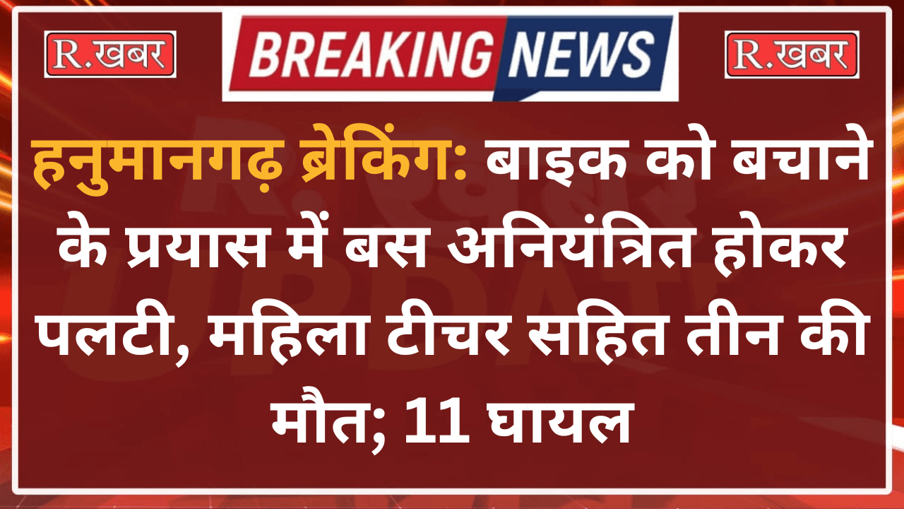 R.खबर ब्यूरो। राजस्थान के हनुमानगढ़ जिले में सोमवार सुबह एक भीषण सड़क हादसे में महिला टीचर सहित तीन लोगों की मौत हो गई, जबकि 11 यात्री घायल हो गए। हादसा संगरिया रोड पर मानकसर के पास उस समय हुआ, जब एक बाइक को बचाने के प्रयास में बस अनियंत्रित होकर पलट गई।