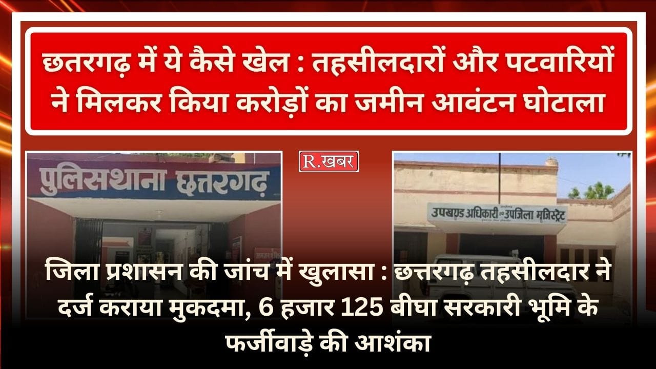 R.खबर, ब्यूरो। बीते पांच साल के दौरान छत्तरगढ़ तहसील में तहसीलदारों, नायब तहसीलदारों और पटवारियों ने मिलकर 6 हजार 125 बीघा रकबाराज (सरकारी भूमि) जमीन के आवंटन में जमकर फर्जीवाड़ा किया। फर्जी दस्तावेज से लोगों के नाम भूमि के इंतकाल तक दर्ज कर दिए। जिला प्रशासन की जांच में खुले इस जमीन घोटाले में डीएलसी दर के हिसाब से 2500 लाख रुपए का राजकोष को नुकसान पहुंचाना पाया गया है। पूरे घोटाले में छत्तरगढ़ तहसील में पदस्थापित रहे तहसीलदार, नायब तहसीलदार और पटवारियों आदि का लिप्त होना सामने आया है। इन सभी के खिलाफ जिला प्रशासन ने मुकदमा दर्ज कराया है।