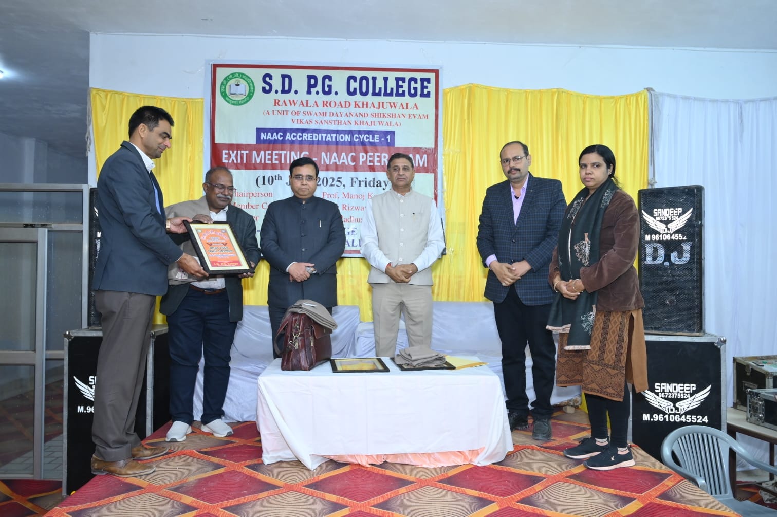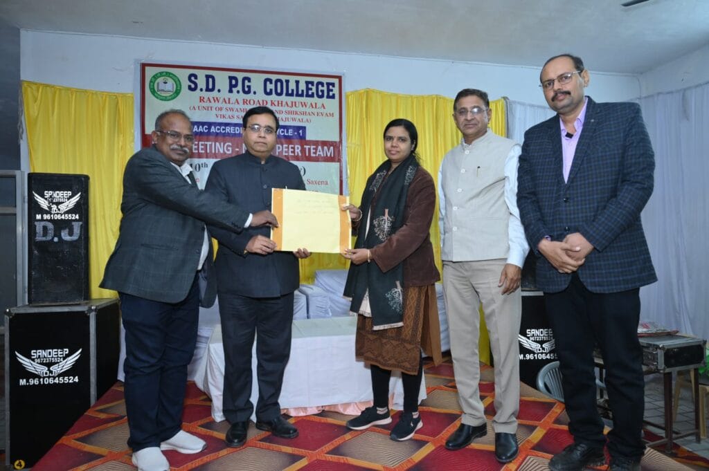 खाजूवाला, राष्ट्रीय मूल्यांकन एवं प्रत्यायन परिषद् नैक पीयर टीम द्वारा एस.डी. पी.जी. महाविद्यालय खाजूवाला का दो दिवसीय निरीक्षण किया गया। नैक निरीक्षण हेतु एकमात्र निजी महाविद्यालय द्वारा आवेदन किया गया था। सर्वप्रथम राजस्थान की शान-राजस्थानी पगड्डी, माल्यार्पण तथा अलगोजा-पुंगी वाद्य यंत्रों व तिलक के माध्यम से नैक टीम का स्वागत किया गया। तत्पश्चात नैक पीयर टीम के चेयर पर्सन प्रो. मनोज कुमार सक्सेना कॉर्डिनेटर मेम्बर प्रो. रिजवानुर रहमान, प्रो मधूसूदन सरनेक द्वारा महाविद्यालय प्रांगण में मां सरस्वती के छायाचित्र के समक्ष द्वीप प्रज्जवलित किया गया।