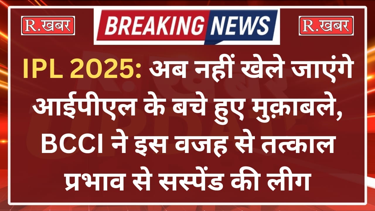 R.खबर ब्यूरो। भारत और पाकिस्तान के बीच युद्ध जैसे हालात को देखते हुए भारतीय क्रिकेट कंट्रोल बोर्ड (BCCI) ने इंडियन प्रीमियर लीग (IPL) 2025 को तत्काल प्रभाव से सस्पेंड कर दिया है। जानकारी के अनुसार बीसीसीआई ने केंद्र सरकार से भी इस मामले पर बातचीत की और फिर यह अहम फैसला लिया।