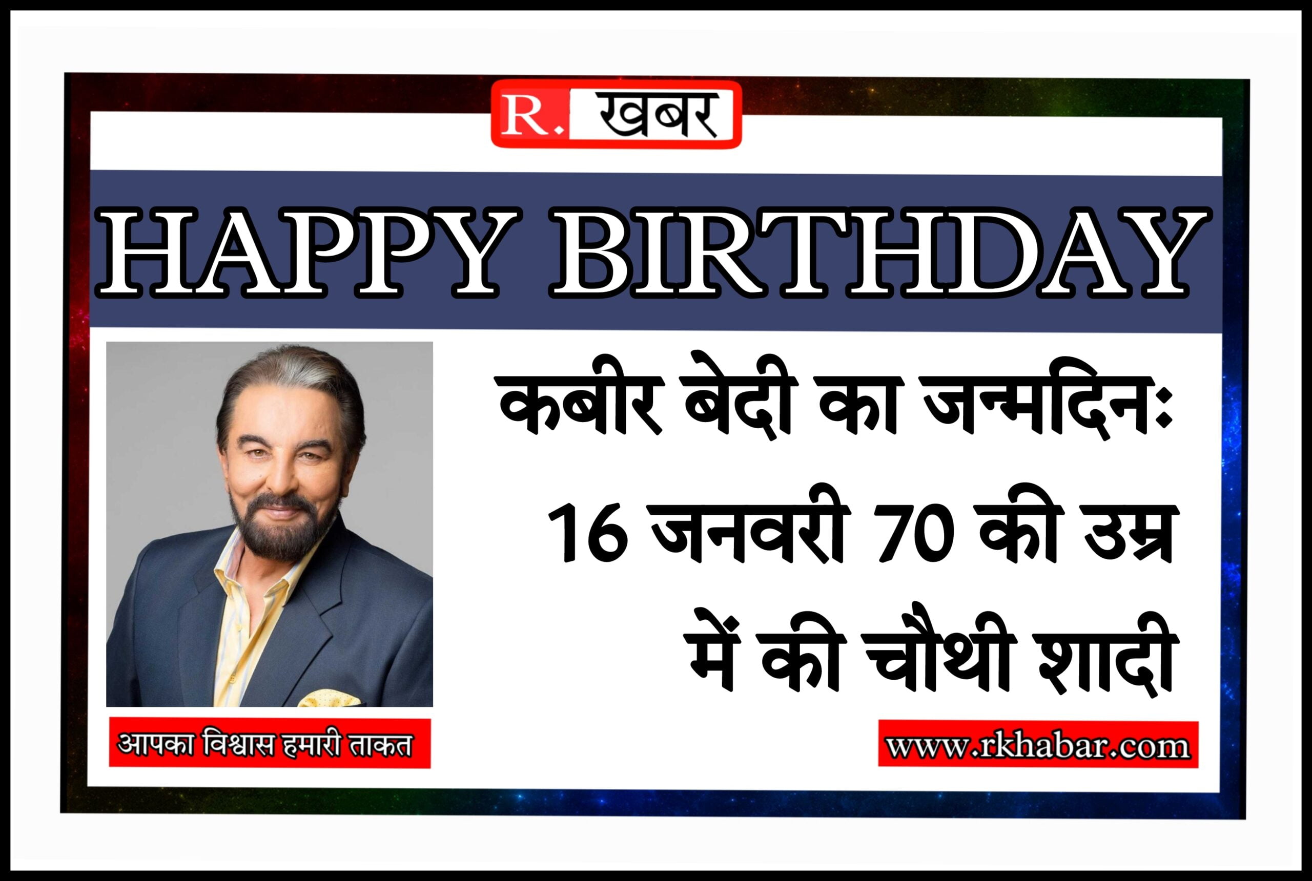 R.खबर, 16 जनवरी 1946 को जन्मे कबीर बेदी 76 साल के हो गए हैं। 1971 से फिल्मी दुनिया में सक्रिय कबीर ने तकरीबन 60 से ज्यादा फिल्मों में काम किया है। इनमें बॉलीवुड फिल्मों के अलावा कई इंटरनेशनल फिल्में भी शामिल हैं।