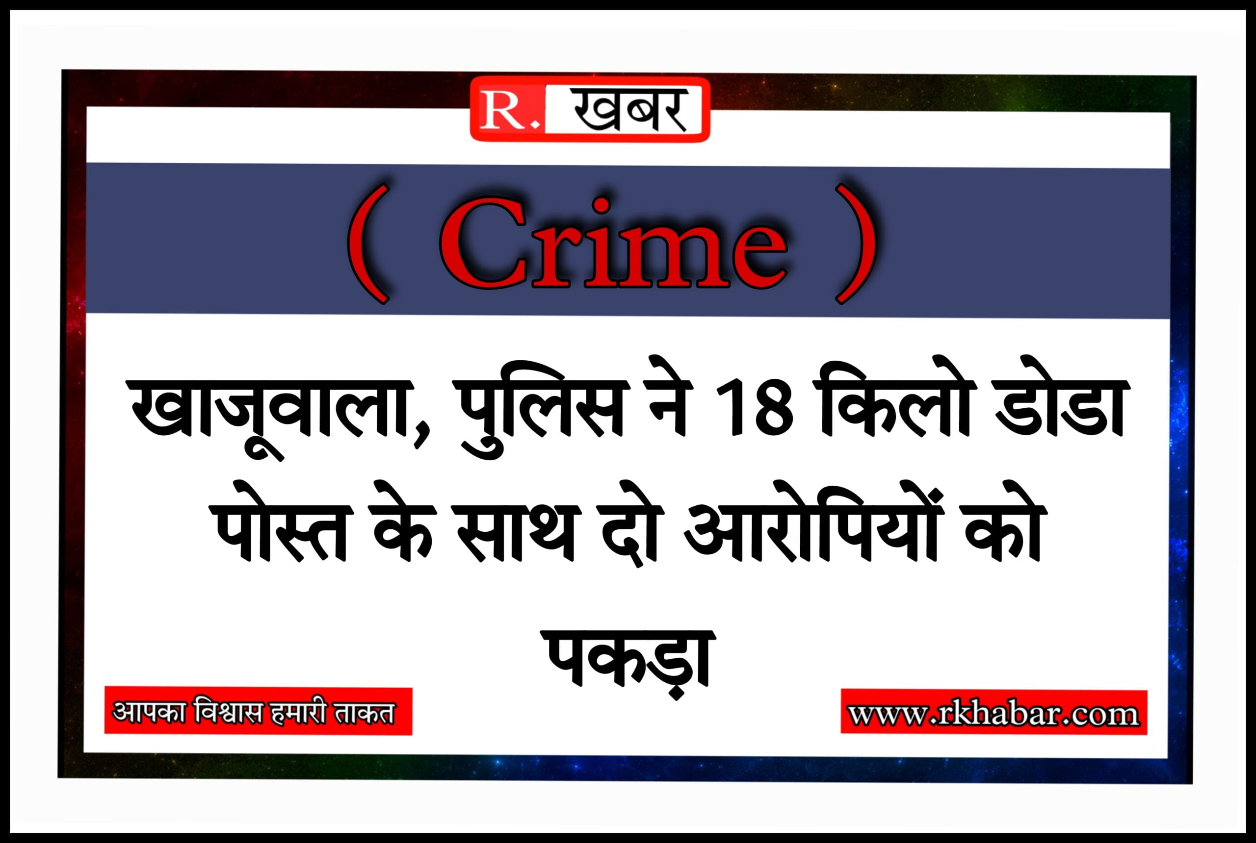 थानाधिकारी अरविंद सिंह शेखावत ने बताया कि खाजूवाला पुलिस थाना में लगातार दूसरे दिन एनडीपीएस एक्ट के तहत कार्यवाही की गई हैं। आरोपियों के कब्जे से पुलिस ने 18 किलो अवैध डोडा पोस्त जप्त किया गया। आरोपियों के खिलाफ एनडीपीएस एक्ट के तहत प्रकरण दर्ज किया गया। बीकानेर रेंज के द्वारा अवैध नशे के विरुद्ध चलाए जा रहे विशेष अभियान ऑपरेशन प्रहार के तहत योगेश यादव पुलिस अधीक्षक बीकानेर के निर्देशन एवं सुनील कुमार अतिरिक्त पुलिस अधीक्षक ग्रामीण जिला बीकानेर व अंजुम कायल वृताधिकारी खाजूवाला के निकटतम सुपरविजन में थानाधिकारी खाजूवाला अरविंद सिंह थाना टीम द्वारा बुधवार को अभियुक्त पूनम चंद पुत्र अमरचंद, शकूर खान उर्फ अमीन खान पुत्र नूरे खान निवासी वार्ड नंबर 13 को खाजूवाला को जगदंबा कॉलेज रोड़ के पास 18 किलो अवैध डोडा पोस्त के साथ गिरफ्तार किया गया। प्रकरण दर्ज कर जांच महेश कुमार शीला पूगल थानाधिकारी पूगल को सुपुर्द की गई।