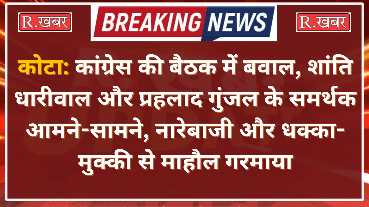 R.खबर ब्यूरो। राजस्थान के कोटा में रविवार (5 अक्टूबर) को कांग्रेस की संगठनात्मक बैठक हंगामे की भेंट चढ़ गई। बैठक के दौरान पूर्व मंत्री शांति धारीवाल और कांग्रेस नेता प्रहलाद गुंजल के समर्थक आमने-सामने आ गए, जिससे माहौल तनावपूर्ण हो गया। शहर कांग्रेस कार्यालय में हुई इस बैठक में जमकर नारेबाजी, धक्का-मुक्की और शक्ति प्रदर्शन हुआ, जिसने पार्टी की अंदरूनी कलह को उजागर कर दिया।