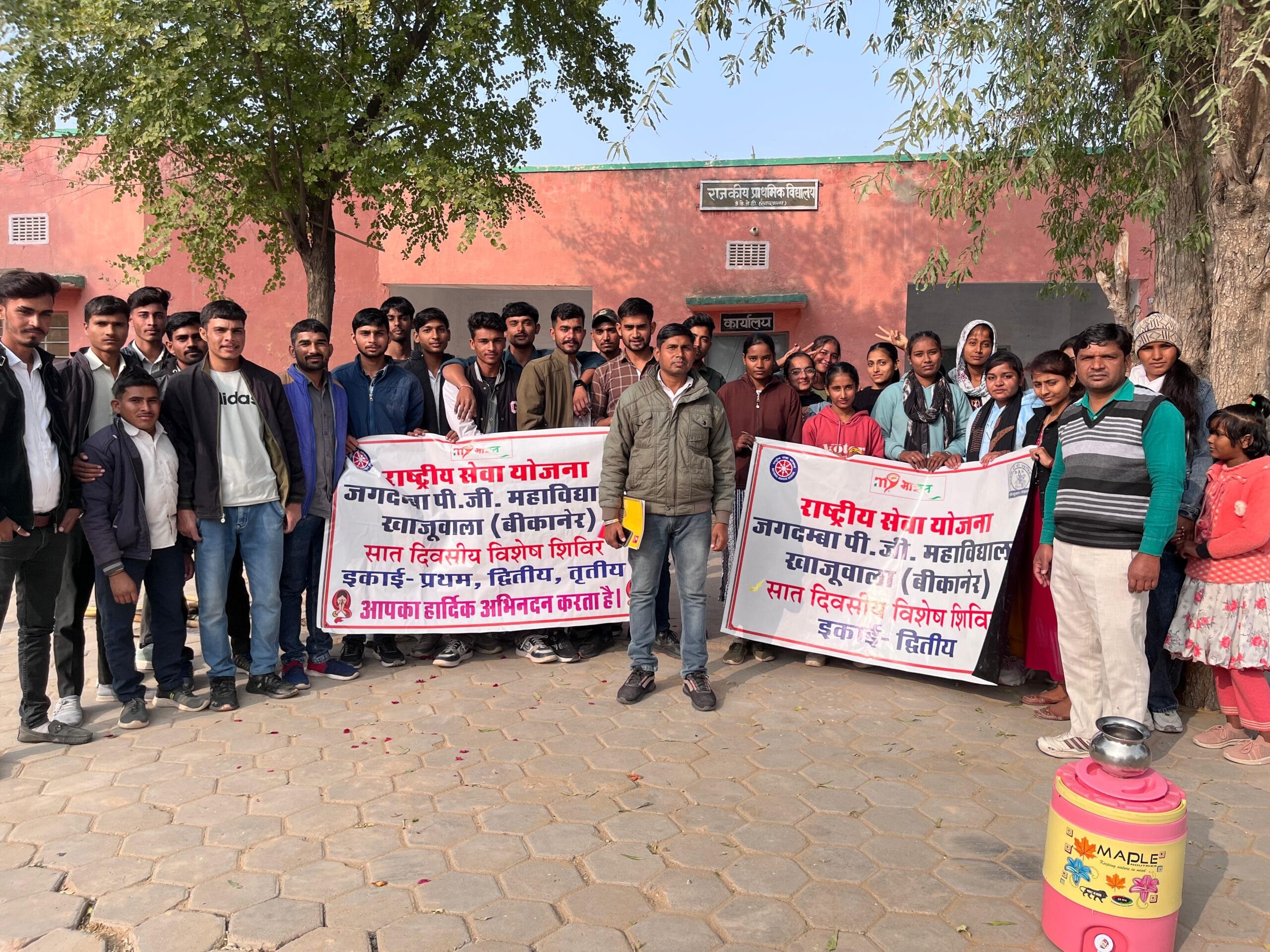 खाजूवाला, जगदम्बा पी. जी. महाविद्यालय खाजूवाला बीकानेर में NSS के सात दिवसीय शिविर के तीसरे दिन तीनों इकाइयों ने गोद लिए गये 8 केजेडी गाँव के राजकीय प्राथमिक विद्यालय में स्वयं सेवकों ने साफ- सफाई एवं पेड-पौधो की कटाई छंटाई करने का श्रमदान किया।