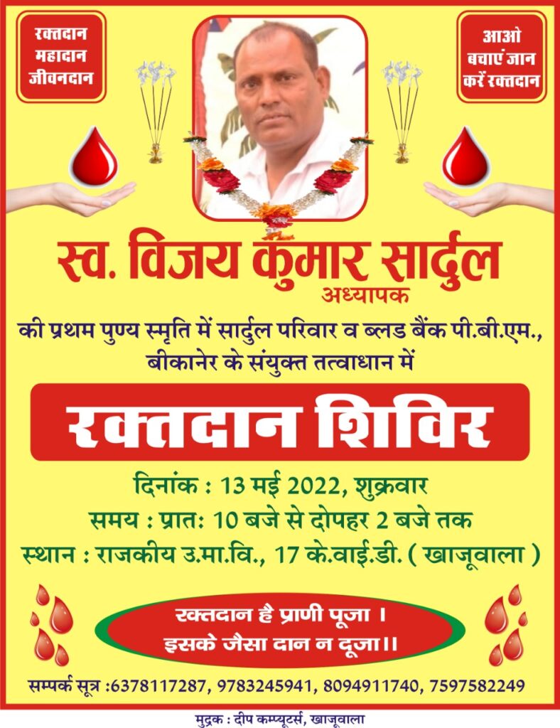 रक्तदान शिविर को सफल बनाने के लिए प्रधानाचार्य मांगीलाल बुगालिया व विद्यालय परिवार द्वारा 5 केवाईडी, 8 केवाईडी, 14 बीड़ी, 12 केवाईडी, 20 बीड़ी, खाजूवाला, 25 केवाईडी, 22 केवाईडी, 7 पीएचएम के संस्था प्रधानों एवं सरपंच प्रतिनिधि 17 केवाईडी तथा पूर्व सरपंच बीड़ी सहित सभी शिक्षाविदों एवं जनप्रतिनिधियों से अधिक से अधिक रक्तदान में पहुंचने के लिए आह्वान किया गया है। बुगालिया ने बताया कि दोनों कार्यक्रमों की को सफल बनाने के लिए हर संभव प्रयास किया जाएगा। इस संबंध में सार्दुल परिवार एवं शिक्षक साथियों साथ बैठक कर कार्यक्रम की रूपरेखा बनाई गई है।