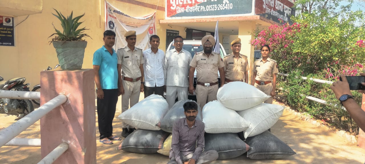 पूगल, महानिरीक्षक पुलिस बीकानेर रेंज बीकानेर ओमप्रकाश, पुलिस अधीक्षक बीकानेर तेजस्वनी गौतम द्वारा आगामी लोकसभा आम चुनाव 2024 को मध्यनजर रखते हुए अवैध मादक पदार्थ के विरूद्ध कार्यवाही हेतू चलाये जा रहे विशेष अभियान के तहत प्यारेलाल श्योराण आरपीएस अतिरिक्त पुलिस अधीक्षक (ग्रामीण) बीकानेर के निर्देशन में तथा विनोद कुमार आरपीएस पुलिस उप-अधीक्षक वृत्त खाजूवाला के निकट सुपरविजन में पूगल थानाधिकारी धर्मेन्द्रसिंह के नेतृत्व में बाबूलाल सउनि, धर्माराम हैडकानि, जगदीश कानि, नेनूराम कानि, हडमानराम कानि द्वारा दौराने गश्त व नाकाबंदी वाहन स्कोर्पियो नम्बर RJ07 UB 1045 से मुल्जिम चन्द्रसिंह पुत्र मालमसिंह जाति रापजूत उम्र 24 साल निवासी चारणवाला पुलिस थाना रणजीतपुरा जिला बीकानेर के कब्जा से 155 किलोग्राम अवैध डोडा पोस्त जब्त किया गया। मुल्जिम गनी खां पुत्र जमे खां निवासी सोलंकियों की ढाणी बीकानेर भागने में सफल हो गया तथा एक एस्कोर्ट करने वाली वाहन में भीमसिंह पुत्र श्री ओमसिंह राजपूत निवासी दंतौर व उसका एक और साथी जो भाग गये। जिस पर एनडीपीएस एक्ट के तहत मामला दर्ज कर कार्रवाई की गई है।