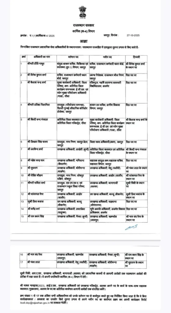 R.खबर ब्यूरो। जयपुर, राजस्थान सरकार ने एक बार फिर प्रशासनिक हलचल मचाते हुए 17 राजस्थान प्रशासनिक सेवा (RAS) अधिकारियों के तबादले कर दिए हैं। यह दो दिनों में सरकार की दूसरी बड़ी कार्रवाई है। इससे पहले शनिवार को ही 67 अधिकारियों का तबादला किया गया था।