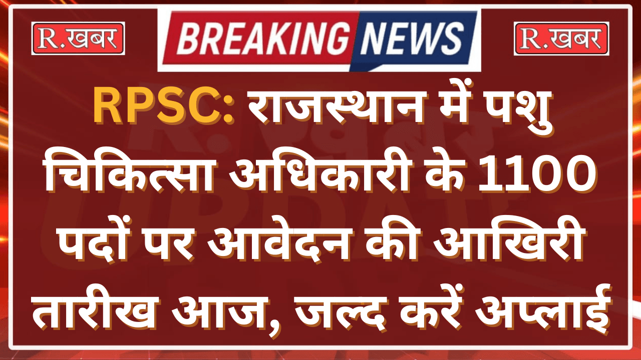 R.खबर ब्यूरो। राजस्थान लोक सेवा आयोग (RPSC) ने पशु चिकित्सा अधिकारी पदों के लिए भर्ती प्रक्रिया 2025 शुरू की थी। इस भर्ती के तहत कुल 1100 पद भरे जाएंगे। इच्छुक और योग्य उम्मीदवारों के लिए आवेदन की अंतिम तारीख आज यानी 3 सितंबर 2025 है। जो अभ्यर्थी अभी तक आवेदन नहीं कर पाए हैं, वे आज ही आधिकारिक वेबसाइट rpsc.rajasthan.gov.in पर जाकर ऑनलाइन आवेदन कर सकते हैं।