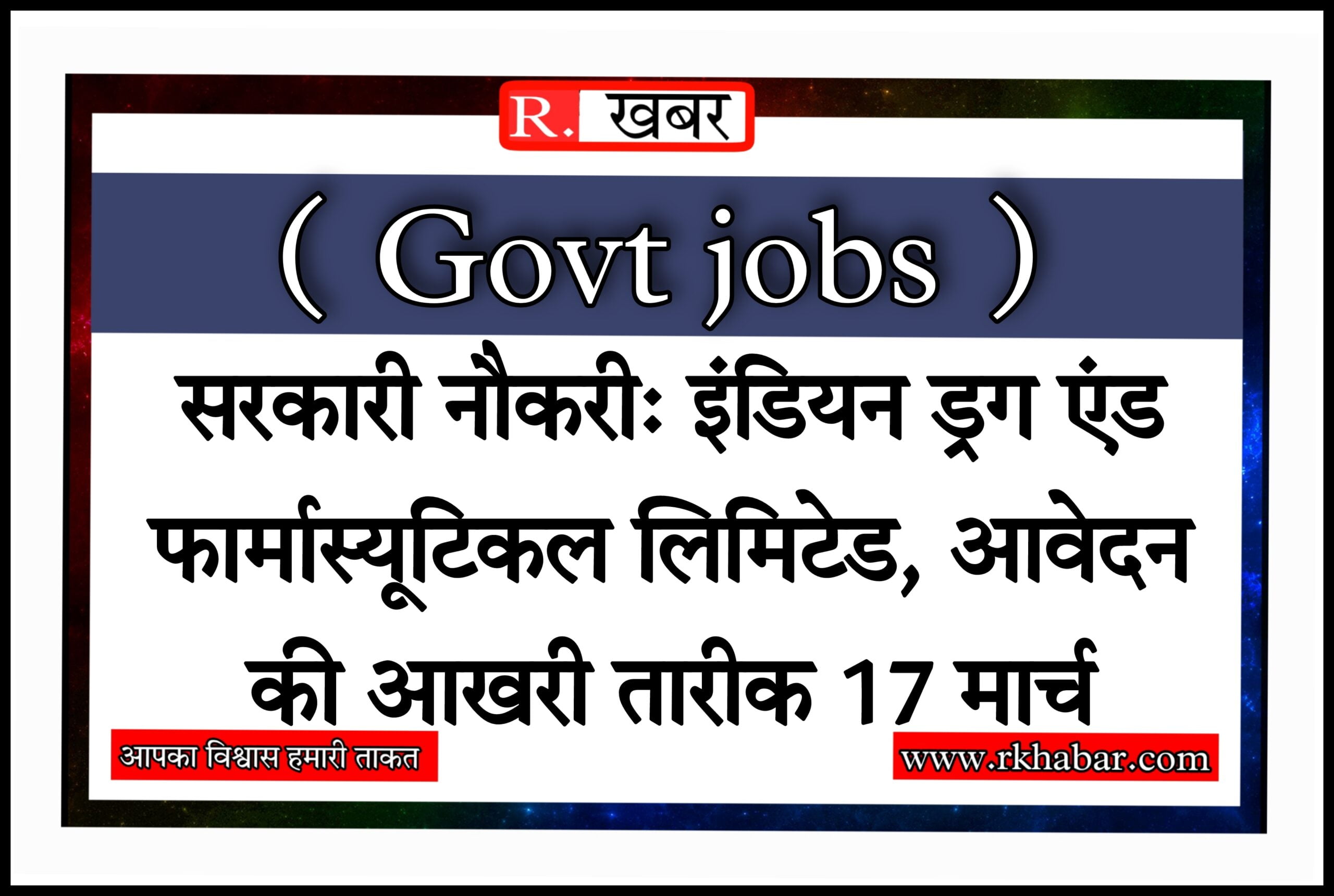 R खबर, भारत सरकार की सार्वजनिक क्षेत्र की फार्मा सेक्टर की कम्पनी इंडियन ड्रग एण्ड फार्मास्यूटिकल लिमिटेड, गुरुग्राम ने अपने कॉर्पोरेट ऑफिस व भुवनेश्वर स्थित संयंत्रों में विभिन्न पदों पर भर्ती के लिए आवेदन जारी किए है।