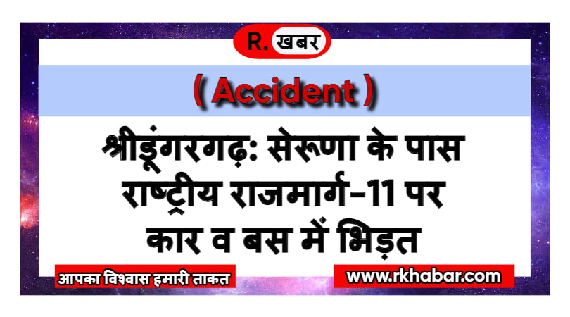 श्रीडूंगरगढ़, सेरूणा थाना क्षेत्र में राष्ट्रीय राजमार्ग संख्या-11 पर एक दर्दनाक हादसा हुआ जिसमें एक बस व कार में टक्कर हो गई जिसमें तीन व्यक्ति घायल हो गए।