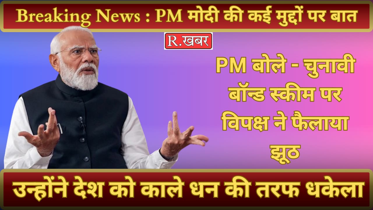R.खबर, ब्यूरो। Lok Sabha Elections 2024 लोकसभा चुनाव 2024 से पहले सुप्रीम कोर्ट (Supreme Court) ने इलेक्टोरल बॉन्ड (Electoral Bonds) को खत्म कर दिया है। विपक्षी दल इसे मुद्दा बना रहे हैं। अब प्रधानमंत्री नरेंद्र मोदी (PM Narendra Modi) ने इलेक्टोरल बॉन्ड के मुद्दे पर बयान दिया है। पीएम मोदी ने विपक्षी दलों पर चुनावी बॉन्ड इलेक्टोरल बॉन्ड्स स्कीम को लेकर ‘झूठ फैलाने का आरोप लगाया है। उन्होंने कहा कि इलेक्टोरल बॉन्ड के कारण आपको मनी ट्रेल का पता चल रहा है। किस कंपनी ने पैसा दिया? उन्होंने पैसे किसे दिया? पैसा कहां दिया? इन सवालों के जवाब मिल पा रहे हैं। इसलिए मैं कहता हूं कि जब विपक्षी दल ईमानदारी से सोचेंगे, तो हर किसी को पछतावा होगा। जो लोग डेटा पब्लिक होने को लेकर हल्ला मचा रहे हैं, उन्हें बाद में अफसोस होगा। उन्होंने देश को काले धन की तरफ धकेला है।
