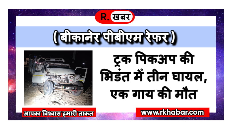 मिली जानकारी के अनुसार खाजूवाला-रावला रोड़ पर गुरुद्वारा तिराहे पर एक ट्रक व पिकअप की आमने-सामने की टक्कर शनिवार देर शांय हो गई। जिसमें पिता-पुत्र सहित एक अन्य व्यक्ति घायल हो गए। पिकअप में गाय डाली हुई थी। जो भिडंत के बाद पिकअप के आगे आकर गिर गई। जिसमें गाय की मौत हो गई। मिली जानकारी के अनुुसार दंतौर निवासी भागीरथ डेलू, कानाराम व मुकेश रावला के पास से गाय लेकर दंतौर जा रहे थे। तभी खाजूवाला पहुंचते ही एक ट्रक के साथ भिडंत हो गई। जिसमें तीनों गम्भीर रूप से घायल हो गए। जिन्हे सीएचसी से प्राथमिक उपचार के बाद बीकानेर रेफर किया गया है। वहीं दुर्घटना में गाय की मौत हो गई।