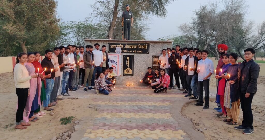 नगर मंत्री पुनीत शर्मा ने बताया कि एबीवीपी द्वारा सोमवार को 14 फरवरी को पुलवामा हमले में शहीद हुए जवानों को श्रृद्धांजलि देते हुए यहां दीप जलाये गए। वहीं मोमबत्तियां जलाकर शहीदों को याद किया गया। कार्यक्रम में जे.एस.सन्धू ने सम्बोधित करते हुए कहा कि हमारे देश के जवान हर समय देश की रक्षा के लिए कटिबद्ध रहते है। एक जवान शहीद होने के बाद अमर हो जाता है। उस जवान को हमें पूजना चाहिए। इसी अवसर पर शहीद ओमप्रकाश बिश्नोई की प्रतिमा के आगे भी दीप जलाए गए। यहां छात्र-छात्राओं ने भारत माता जय के नारे लगाए। इस अवसर पर पुनीत शर्मा, यश सारस्वत, अमन भांभू, करण सहारण, मोहित, प्रमोद, गजू, देवेन्द्र, गौरव, अब्बास, मुशर्रफ़, विकाश, राहुल, जितेंद्र, पंकज, भव्या, लता, वाणी, गायत्री, सुमन, राजवीर, स्नेहा, खुशी, प्रियंका आदि उपस्थित रहे।