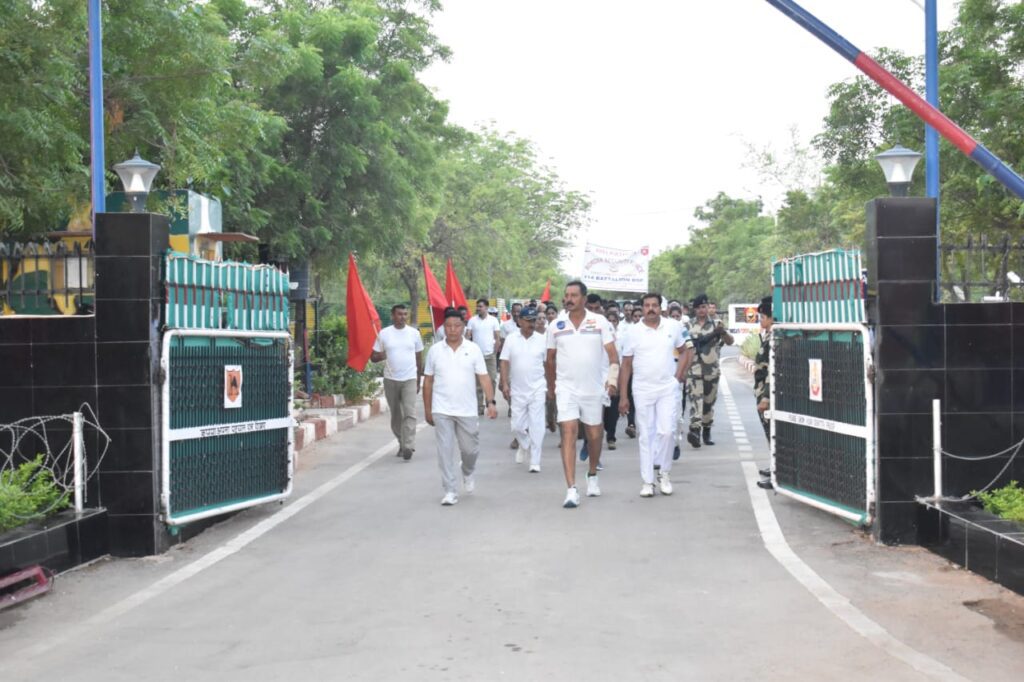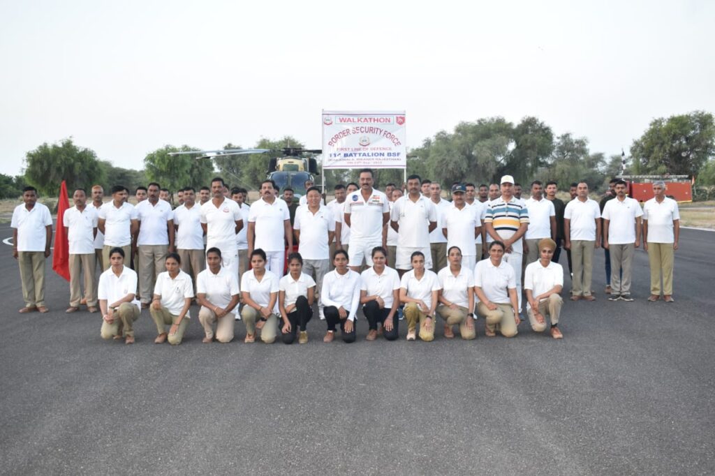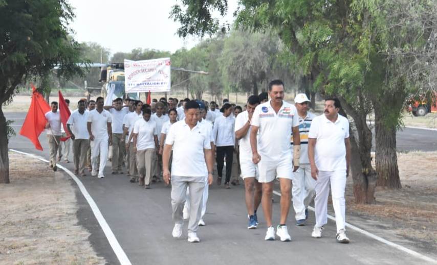 आजादी के अमृतकाल महोत्सव के तहत बीएसएफ 114 वीं वाहिनी सीमासुरक्षाबल मुख्यालय से डीआईजी पुष्पेन्द्र सिंह राठौड़ के निर्देशन में 7 किलोमीटर की पैदल यात्रा की गई। जिसमें बीएसएफ के जवान व अधिकारी उपस्थित रहे। यह यात्रा खाजूवाला स्थित बीएसएफ रिट्रीट परेड ग्राऊण्ड में आकर सम्पन्न हुई। यहां डीआईजी राठौड़ ने जवानों को हमेशा फीट रहने का संदेश दिया। साथ ही स्वास्थ्य का ध्यान कैसे रखे इस बारे में बताया। वहीं नियमित व्यायाम करने की सलाह दी। वहीं डीआईजी राठौड़ ने जवानों व अधिकारियों को आवश्यक दिशानिर्देश भी दिए। इस मौके पर डीआईजी पुष्पेन्द्र सिंह राठौड़, कमाण्डेंट महेन्द्र सिंह, सेक्टर कमाण्डेंट सतीश कुमार सेक्टर, डीसी जी ब्रांच दीपेन्द्र मोहन उनेटा, डिप्टी कमाण्डेंट विनोद बड़सरा, प्रताप भानू भाखर, अजयवीर सिंह सहित दर्जनों अधिनस्त अधिकारी व जवान तथा महिला जवान उपस्थित रही।