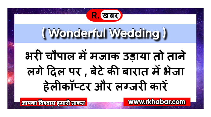 R खबर, बेटे की शादी तय होने पर गांव के लोगों ने दुल्हे के पिता राधेश्याम को भरी चौपाल में ताना मारा की क्या तू अपने बेटे की बारात हेलीकॉप्टर से लेकर जाएगा। लोगों के बीच यह बात हुई तो दूल्हे के पिता ने इसे दिल पर ले लिया और जिसके बाद दूल्हे के पिता ने बेटे की बारात के लिए 6 लाख में हेलीकॉप्टर बुक कर लिया साथ ही लग्जरी कारों का काफिला भी बारात में शामिल कर दिया।